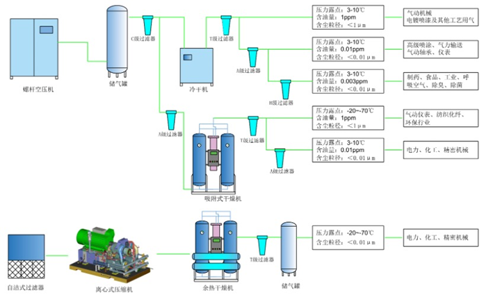冷冻式压缩空气干燥机利用冷却空气,降低空气温度的原理,将湿空气中的水份通过冷凝后从空气中析出,得到干空气。吸附式干燥机分为FWR(微热吸附式干燥机)、FWQ(无热再生吸附式干燥机)